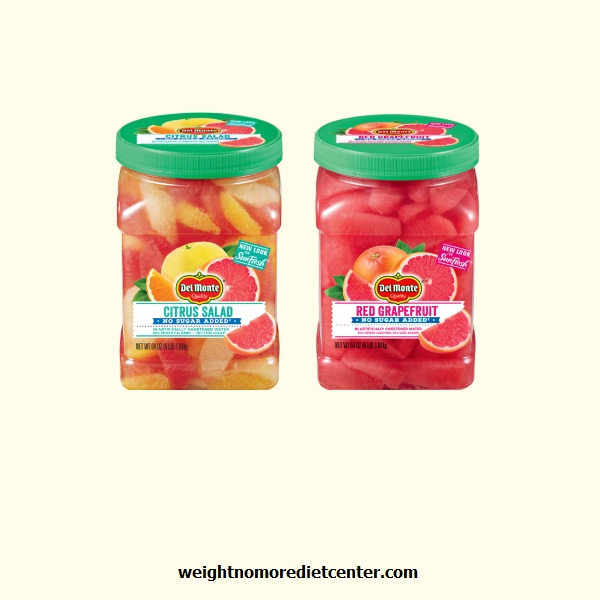 In my house, when it comes to canned fruit, we buy DelMonte chilled, jarred fruit. These can be found in the refrigerated part of the Produce section of your supermarket. My husband prefers their fruits in extra light syrup (Citrus Salad, Mango Chunks, Mango & Pineapple, Red Grapefruit). I prefer the two they offer with no sugar added (Citrus Salad and Red Grapefruit). Whichever option you may choose, 1/2 cup = 1 Fruit serving. (I will use a slotted spoon to measure out ½ of the Red Grapefruit, pack it for the office, as well as take a snack-size 2% or 4% Breakstone cottage cheese cup. I’ll mix the two for either my mid-morning or afternoon snack at my desk.)
